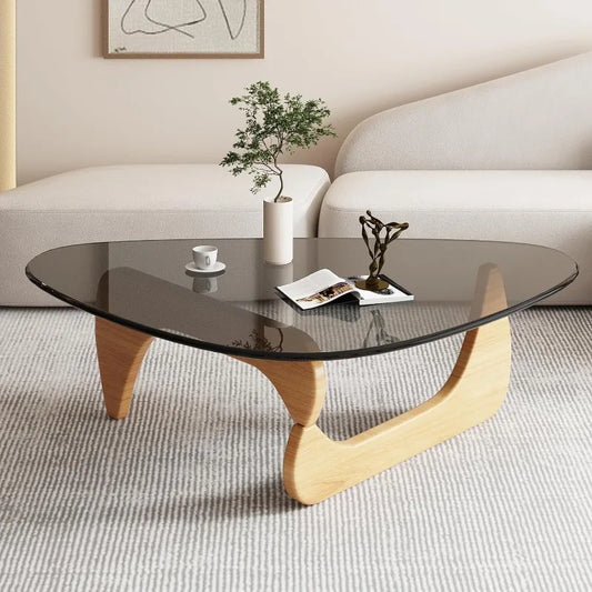 Triangle Glass Coffee Table with Wooden Base Mid-Century Modern Abstract End Table